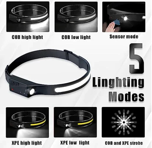 🖐️ Waving Hand Control: The LED headband torch offers 5 modes: COB High > COB Low > XPE High > XPE Low > Strobe mode. It features a convenient motion sensor that allows you to turn the headband torch on/off simply by waving your hand.